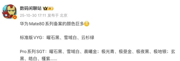 除此之外,近日的消息中还曝光了华为Mate80系列的备案颜色:
