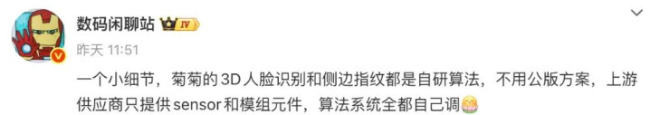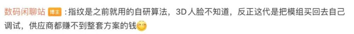 同时,这位博主还补充称,“指纹是之前就用的自研算法,3D人脸不知道,反正这代是把模组买回去自己调试,供应商都赚不到整套方案的钱”。